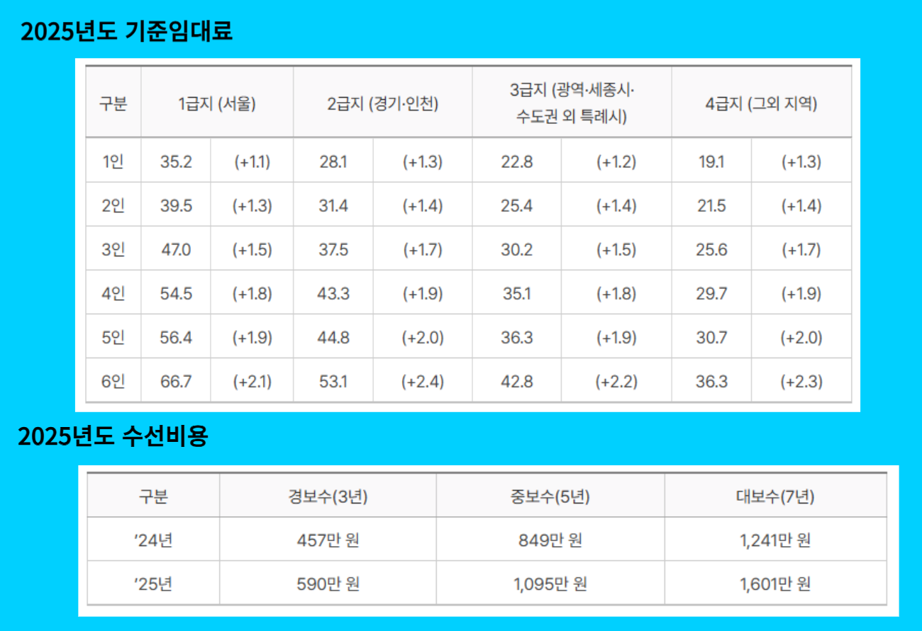 2024년 대비 최대 7.8% 인상되었습니다. 수선유지 급여도 최근 4년 간 공사비 상승률을 반영하여 올해 한도 29% 인상이 되었답니다.